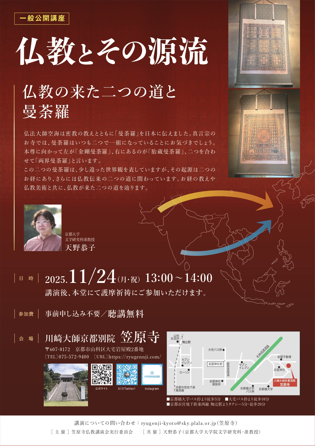 令和7年11月24日(月・祝)に「仏教とその源流-仏教の来た二つの道と曼荼羅-」というタイトルで以下のとおり一般公開講座を開講いたします。
